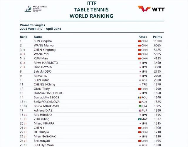 女乒集团优势越发恐怖,前二十占6席不说,前五直接清场。