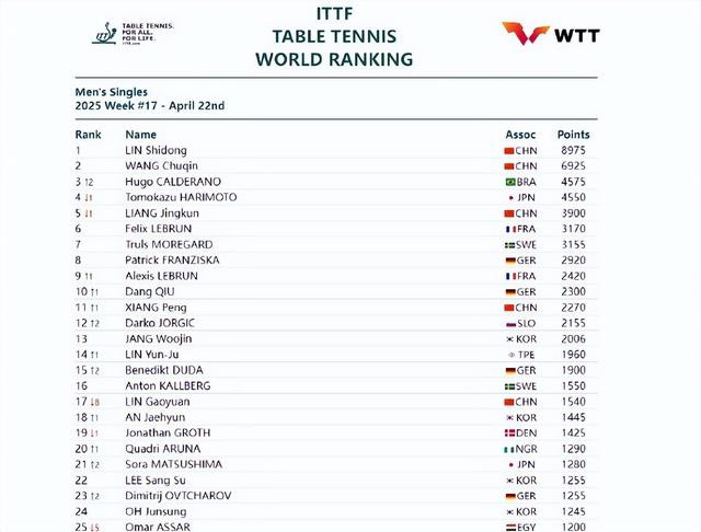 林诗栋守住了球王宝座,王楚钦稳坐第二,不过他俩积分差距已经拉开到2050分。